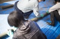 The morning started with introductions. The group shared a friendly air, with many of them coming from regions as far as Hokkaido or Kumamoto. They also talked about how most of them had salmon rice balls for breakfast. After, they split into 4 teams and began by removing the natural oils in the bamboo. In the afternoon the groups then used power drills to assemble the bamboo before arranging the autumn flora. Though there was hesitation doing this work for the first time, soon enough their teamwork took over, and excitement spread throughout while of building the large works.