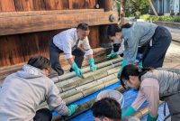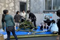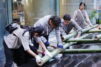 The morning started with introductions. The group shared a friendly air, with many of them coming from regions as far as Hokkaido or Kumamoto. They also talked about how most of them had salmon rice balls for breakfast. After, they split into 4 teams and began by removing the natural oils in the bamboo. In the afternoon the groups then used power drills to assemble the bamboo before arranging the autumn flora. Though there was hesitation doing this work for the first time, soon enough their teamwork took over, and excitement spread throughout while of building the large works.